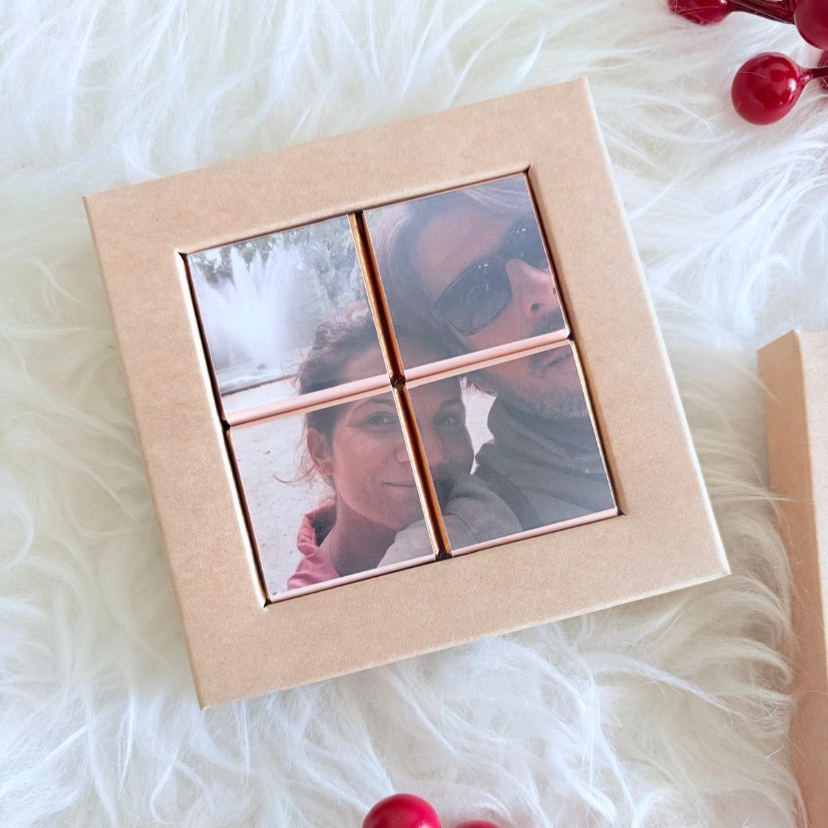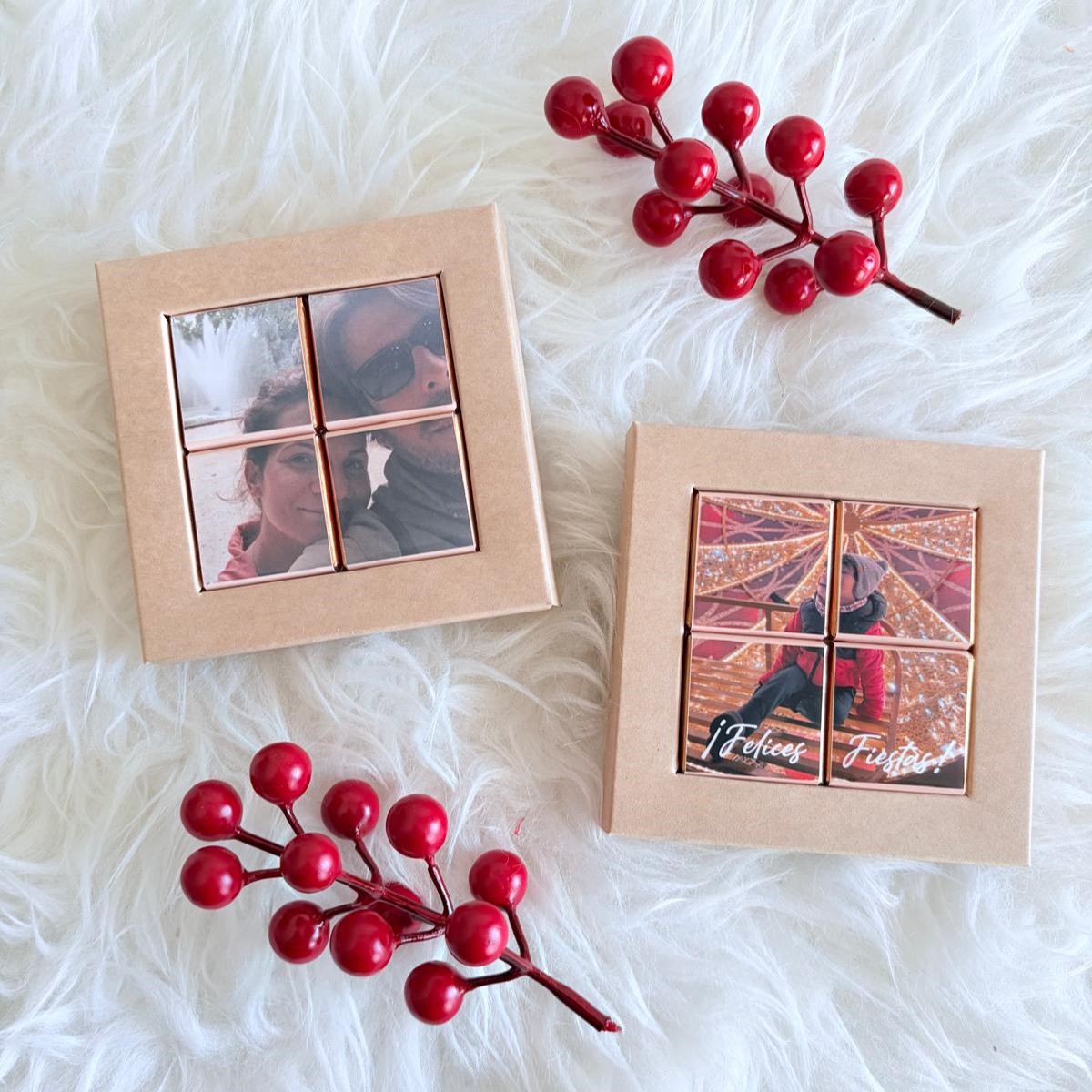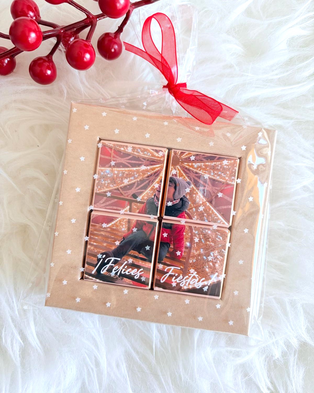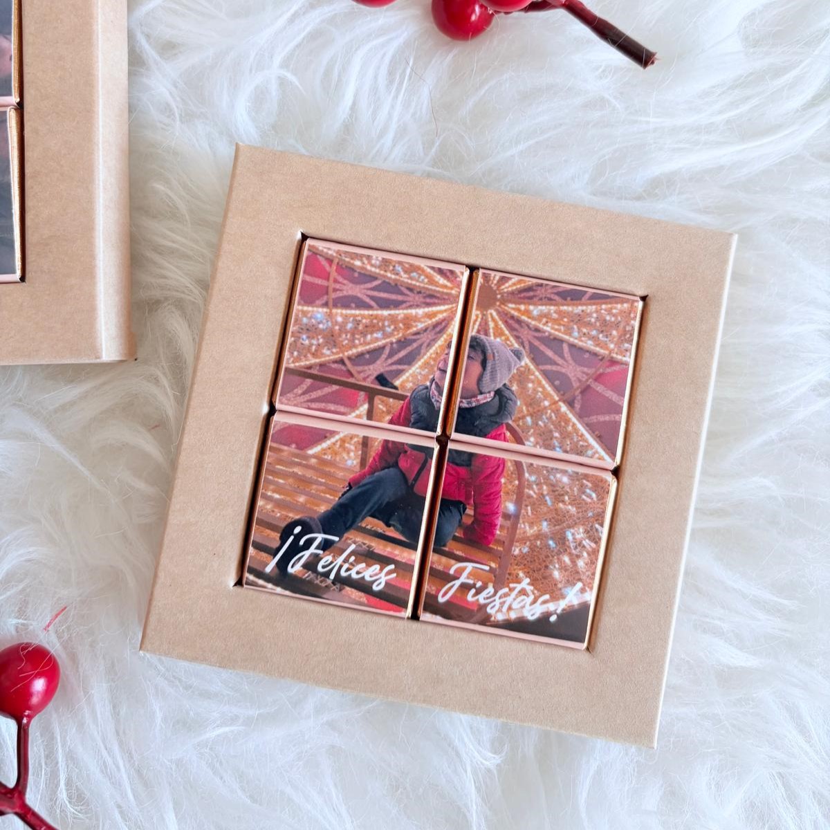 Sorprende a tus seres queridos con un regalo único y lleno de emoción. Nuestra caja de 4 chocolatinas personalizadas convierte tus mejores recuerdos en un detalle dulce y original. Cada chocolatina incluye una parte de la fotografía, formando una imagen completa al unirlas. ¡Un regalo irresistible y lleno de sentimiento!