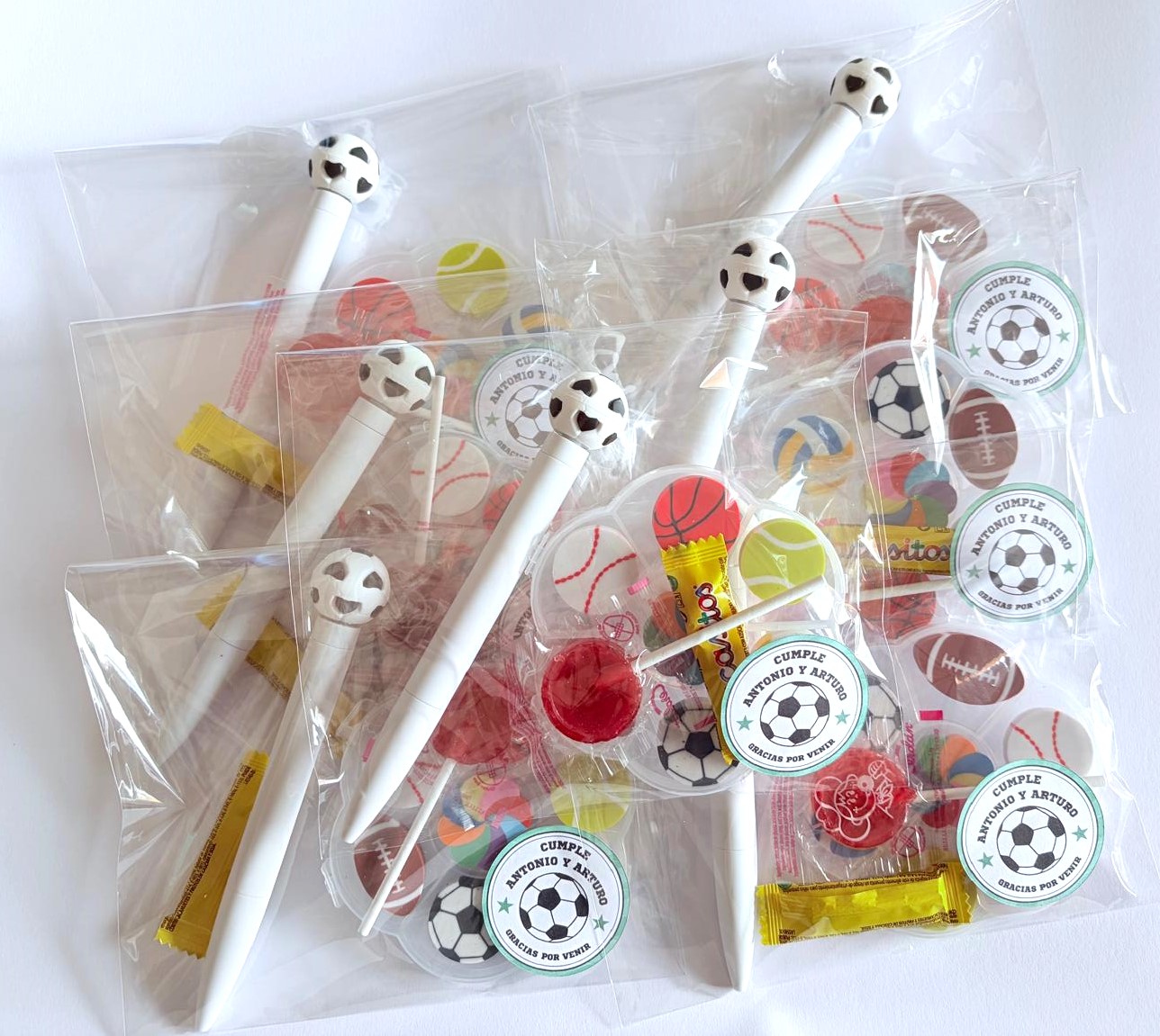 El pack está compuesto por una caja de 7 gomas con cierre lateral, un bolígrafo y un paquete de lacasitos mini, todo en una bolsa con la etiqueta de tu evento.