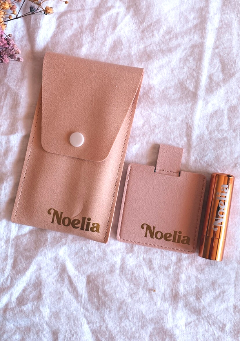 ¡Sorprende con un regalo práctico, elegante y personalizado! Ideal para llevar de viaje o para el día a día. El set incluye un estuche rosa efecto piel personalizable con 8 brochas de maquillaje y puedes combinarlo con un elegante espejo de madera o todo el set en tonos rosas con espejo en efecto piel y labial con aroma a vainilla.