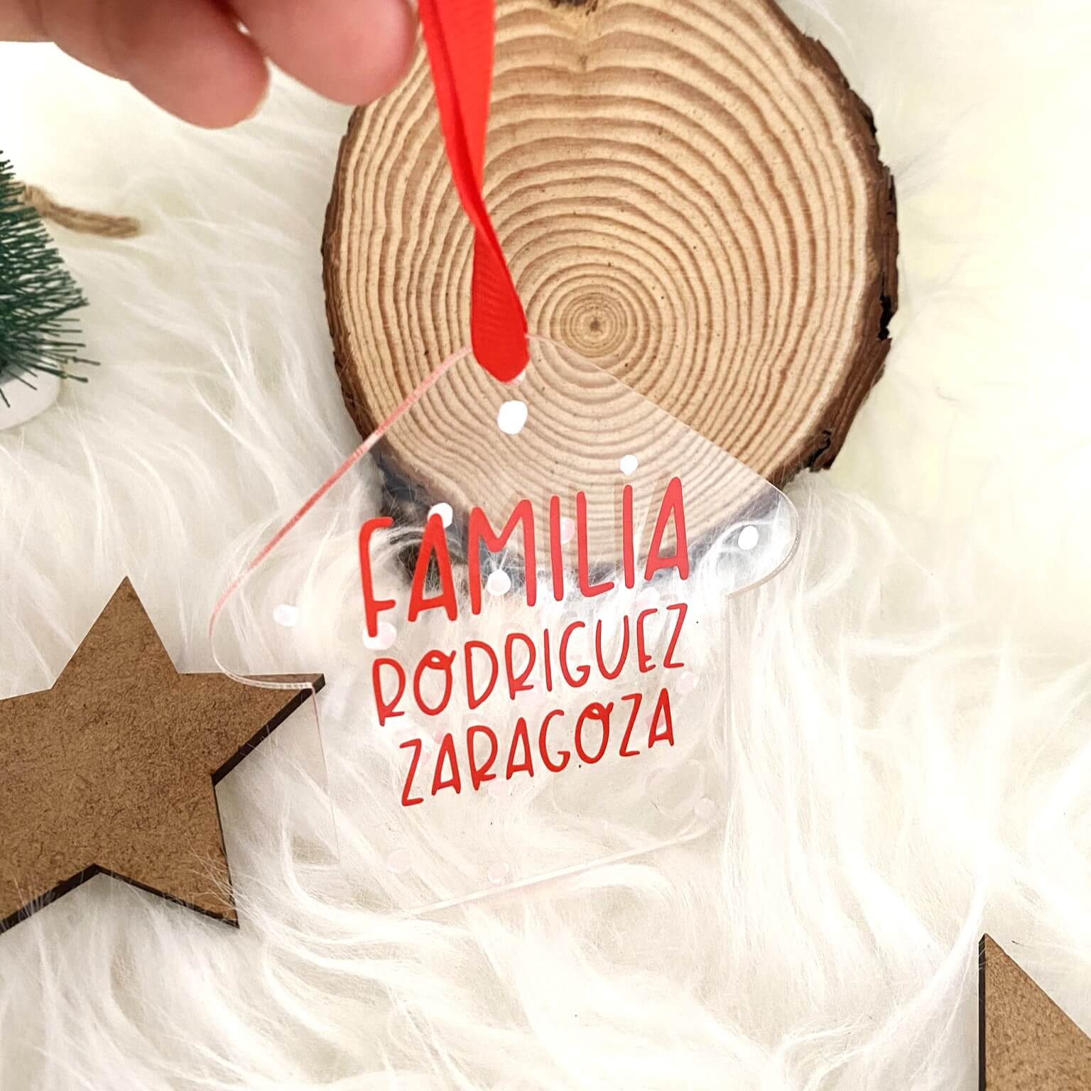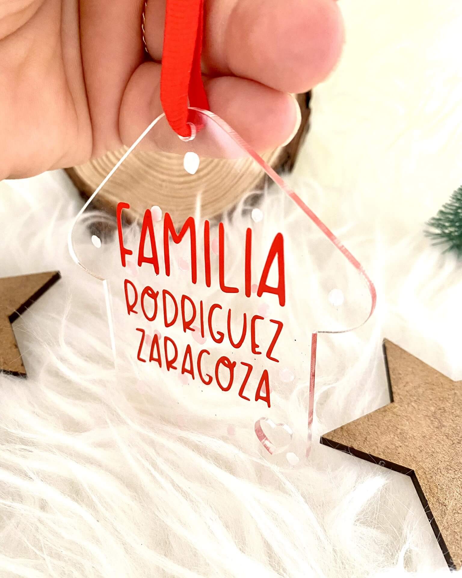 • El adorno está hecho a doble cara, por una cara hay copos que se harán en blanco y la otra cara será con los apellidos de la familia de la misma forma que se ve en la foto.