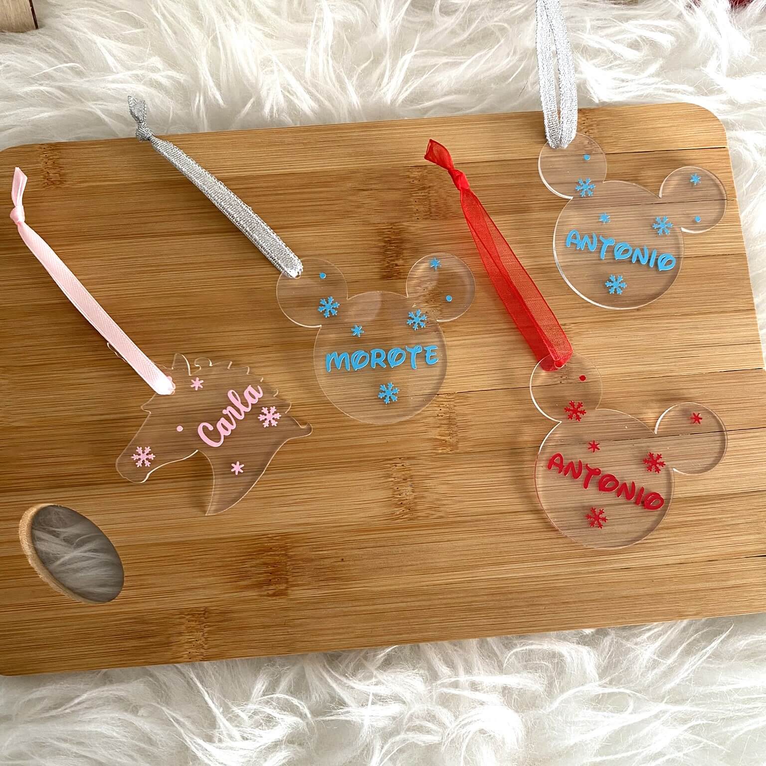 - Adorno de metacrilato transparente en forma de Mickey. Medidas: 8×8 cm aprox