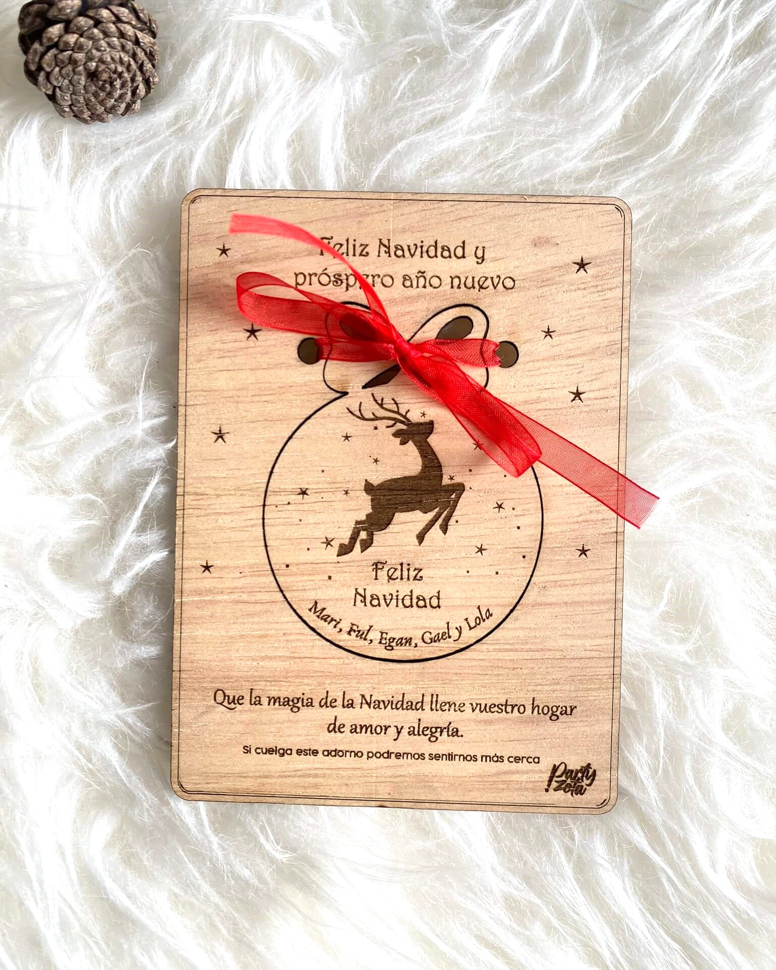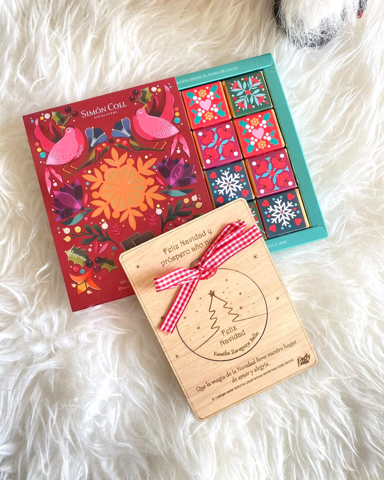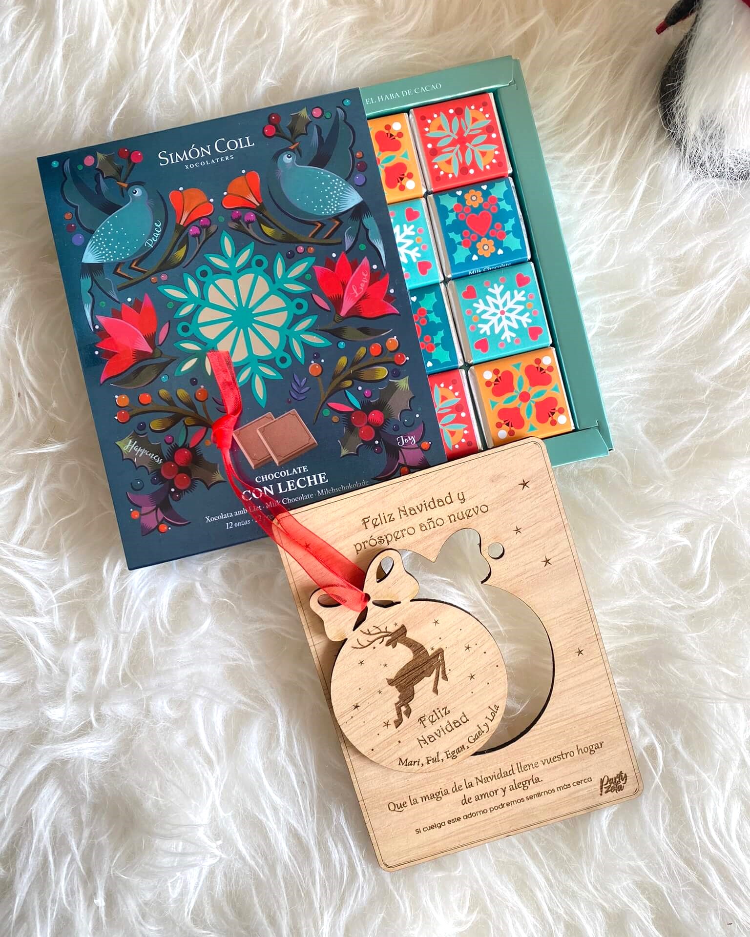 Este pack incluye una postal / adorno de madera personalizado (ideal para colgar en el árbol) y una selección de chocolates artesanales, todo empacado con cuidado y listo para regalar.