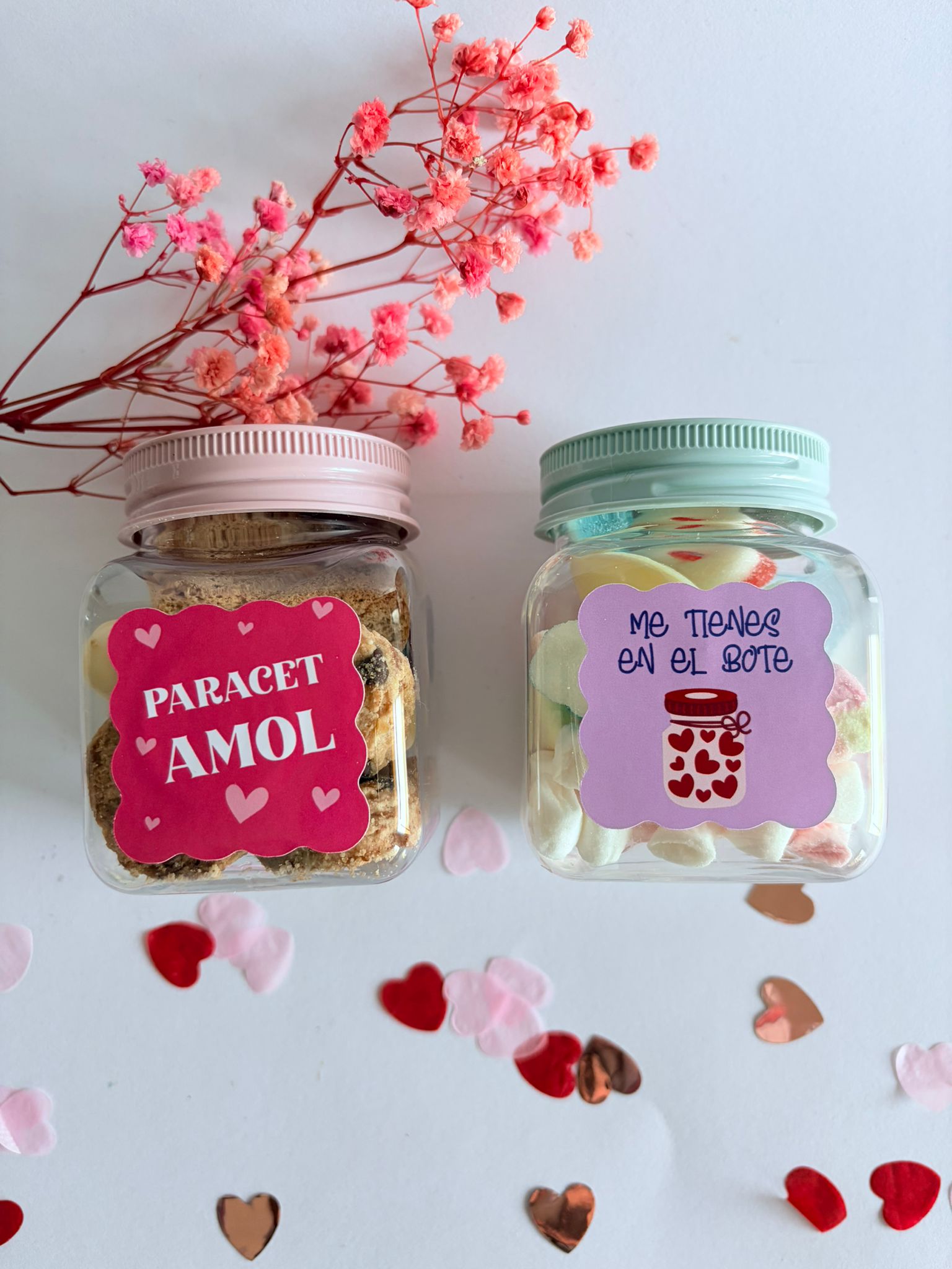 Botes llenos de chuches, galletas y AMOR con mensajes personalizados para San Valentín.